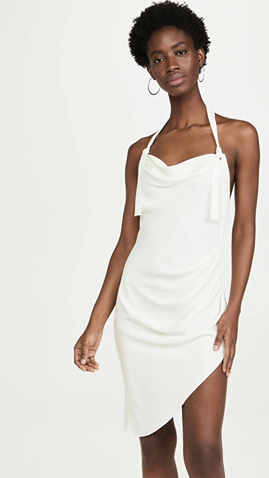 A silky slip dress from the specialists in special-occasion dressing at Amanda Uprichard. This piece adds a number of distinct elements to a classic silhouette, like an asymmetrical skirt and a knotted halter neckline.