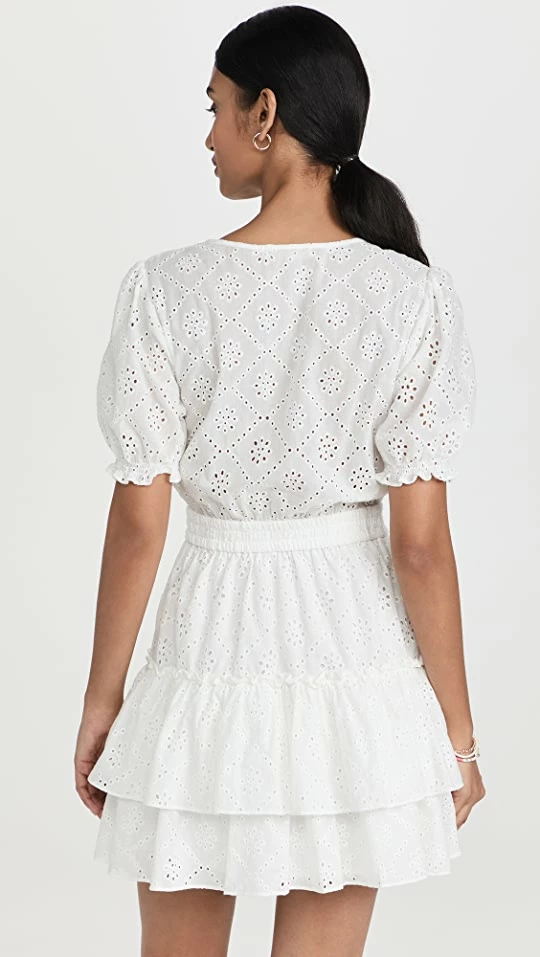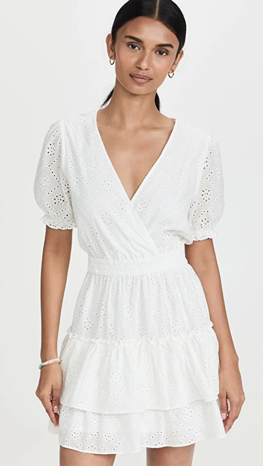 An effortlessly pretty WAYF day dress, distinguished by a tiered skirt and floral eyelet patterning throughout the silhouette. Take advantage of the deep surplice neckline and spotlight an understated necklace.